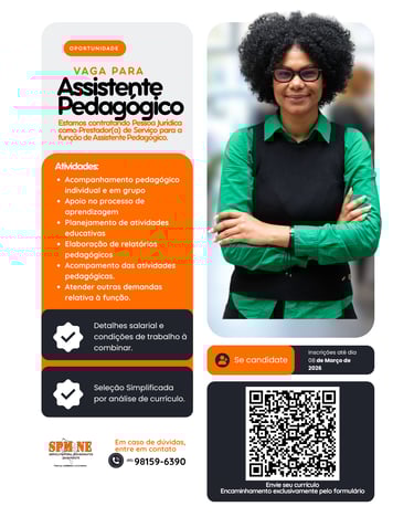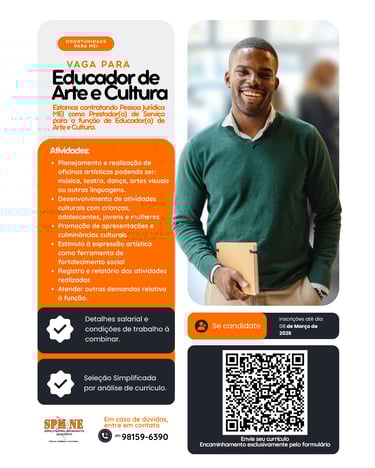 As vagas são destinadas à contratação de Pessoa Jurídica (MEI), para atuação como prestador(a) de serviço, por meio de seleção simplificada com análise de currículo. Estamos em busca de profissionais comprometidos(as), organizados(as), com sensibilidade social e alinhados(as) à nossa missão institucional.